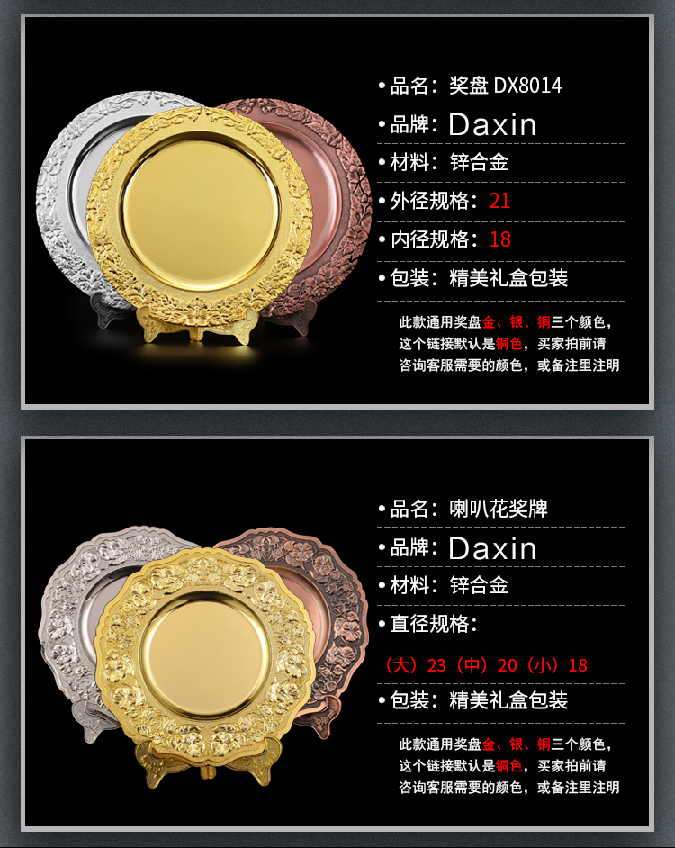 502 / 喇叭花奖盘奖牌金属锌合金奖碟商会体育运动比赛表彰颁奖定制印字