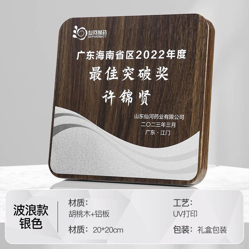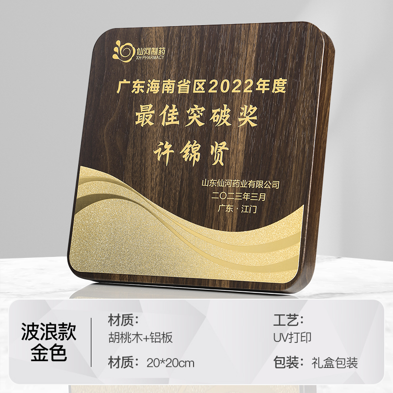 514 / 金属波浪胡桃木奖牌木质奖牌定制胡桃实木加盟牌匾代理商金箔授权牌荣誉退休铜牌定做