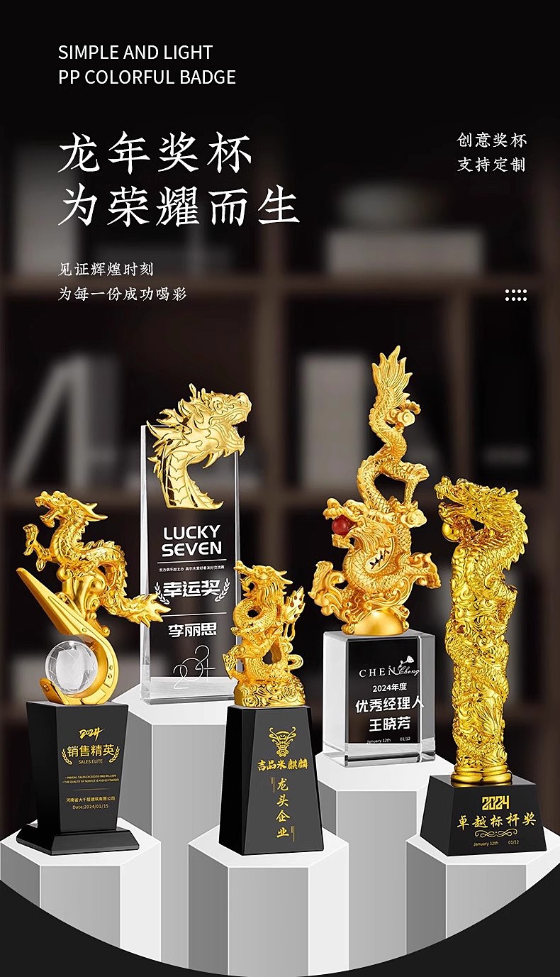 423 / 【生肖龙主题】龙年水晶奖杯定制金属龙型奖牌金银铜定做公司年会员工销冠颁奖杯