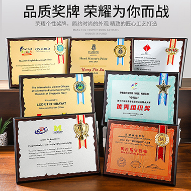 543 / 成都金属花框奖牌高档牌匾仿胡桃木花框奖牌木托牌制作…
